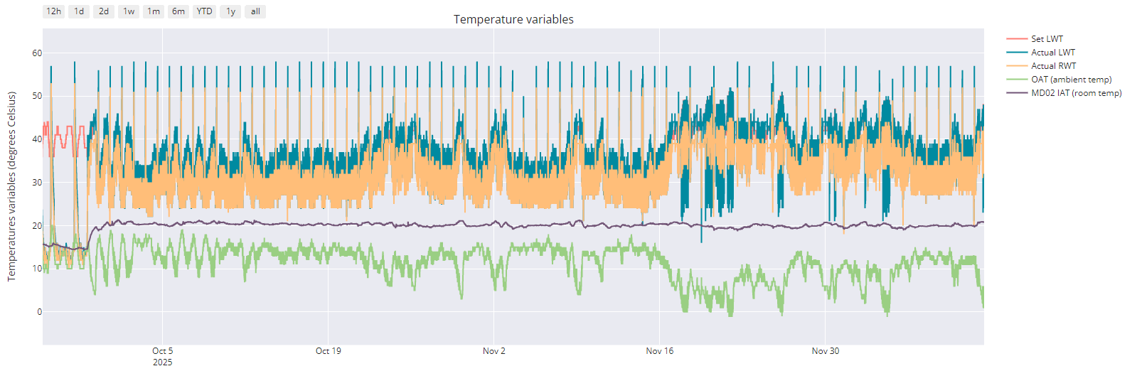 I am not sure about this. The IAT is what matters to the inhabitants. If the fabric is still re-absorbing energy despite a recovered IAT, and I agree it may be, the heat pump and it's control logic doesn't know this (it doesn't know what the IAT is, let alone the energy flux in the fabric), it only knows and only uses the OAT/AIT to set the set LWT and so in due course the energy in. Yes, it does also know the RWT, but, subject to being corrected, because this is a grey area that may be relevant, I don't think that is used in any way to set the LWT, which is merely derived from the WCC.