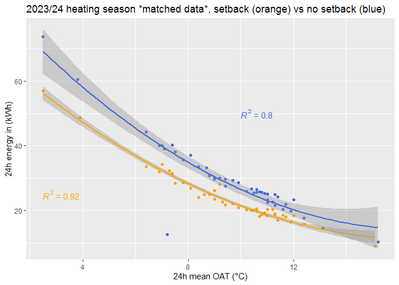 The scatter about the line is random variation which is to be expected, indeed I would be rather worried if it wasn't there. @adrian "I suspect your curve fitting is to the data that includes the cutback and recovery and hence expects the usage during recovery." No, this plot is only for data points when the heat pump was running, it includes recovery periods but not the setbacks. It is also space heating only, no DHW heating.