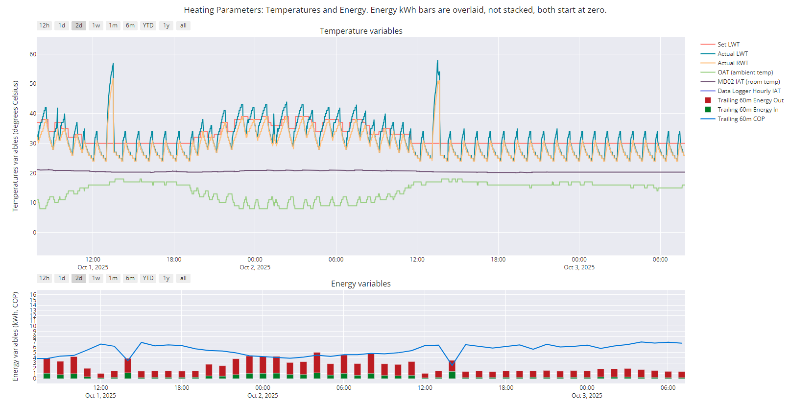 Her's my chart for the last two days. I think it bears out the above ie at 15 degrees and above OAT, the set and actual (average) LWT is 30, ie the heat pump doesn't turn off. That will only happen if I dial down the room stat, or otherwise fully turn off the heating: