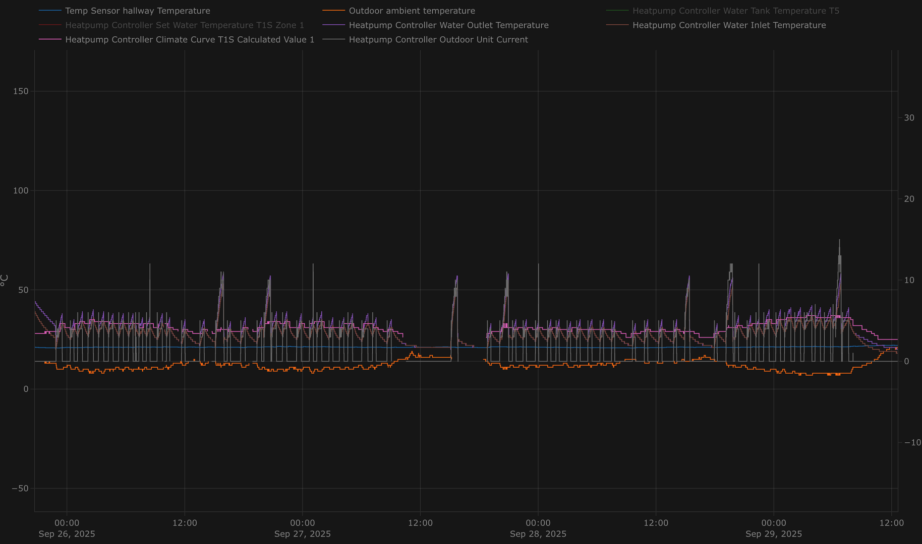 Moving on to the turning off question, yes, your heat pump spends several hours in the off state (zero amps in) in your chart, from about 1200 to 1800 on 27th Sep (but with a DHW spike in the middle), and again 0900 to 1200 on the 29th Sep. But these are notably periods when the OAT was highest, and, I suspect, though some of the data is missing, the set LWT is at or very close to the IAT. At such a state, the heat pump doesn't need to do anything. The building is in effect keeping the circulating water at or close to the set LWT, so the heat pump doesn't come on, or rather, stays off, while in that state.