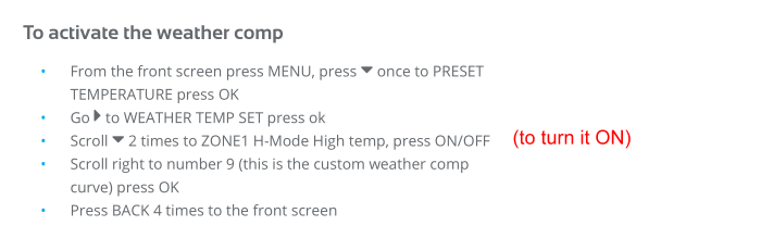 In practice and in the real world, you set the unit to fixed flow temp or weather compensation on the wired controller using Menu > PRESET TEMPERATURE > WEATHER TEMP SET tab and set the the ZONE1 H-MODE HIGH TEMP to ON and then select curve 9, which is the one where you can adjust the end point settings (via the FOR SERVICEMAN menu). With this done, you will now have a tear drop on the left hand side of the wired controller display, at least I do, yet I am running WC mode. Somehow, somewhere, something got lost in translation...