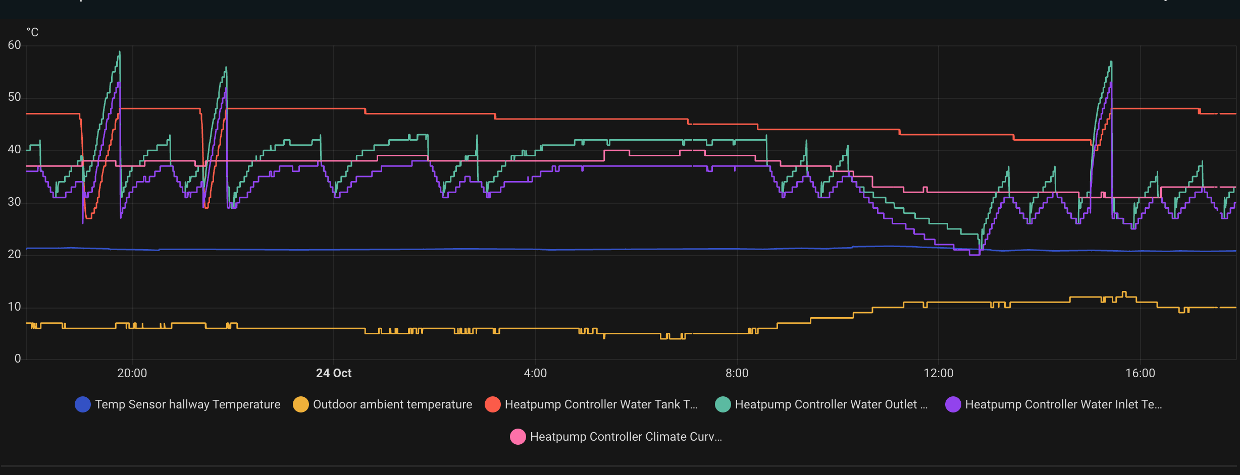 When the OAT has dropped to around 4 or 5 degrees C, this is where the cycling or oscillating has stopped and there's a much steadier outlet flow temp just above the curve set point. @cathoderay I recall you mentioning yours did similar.