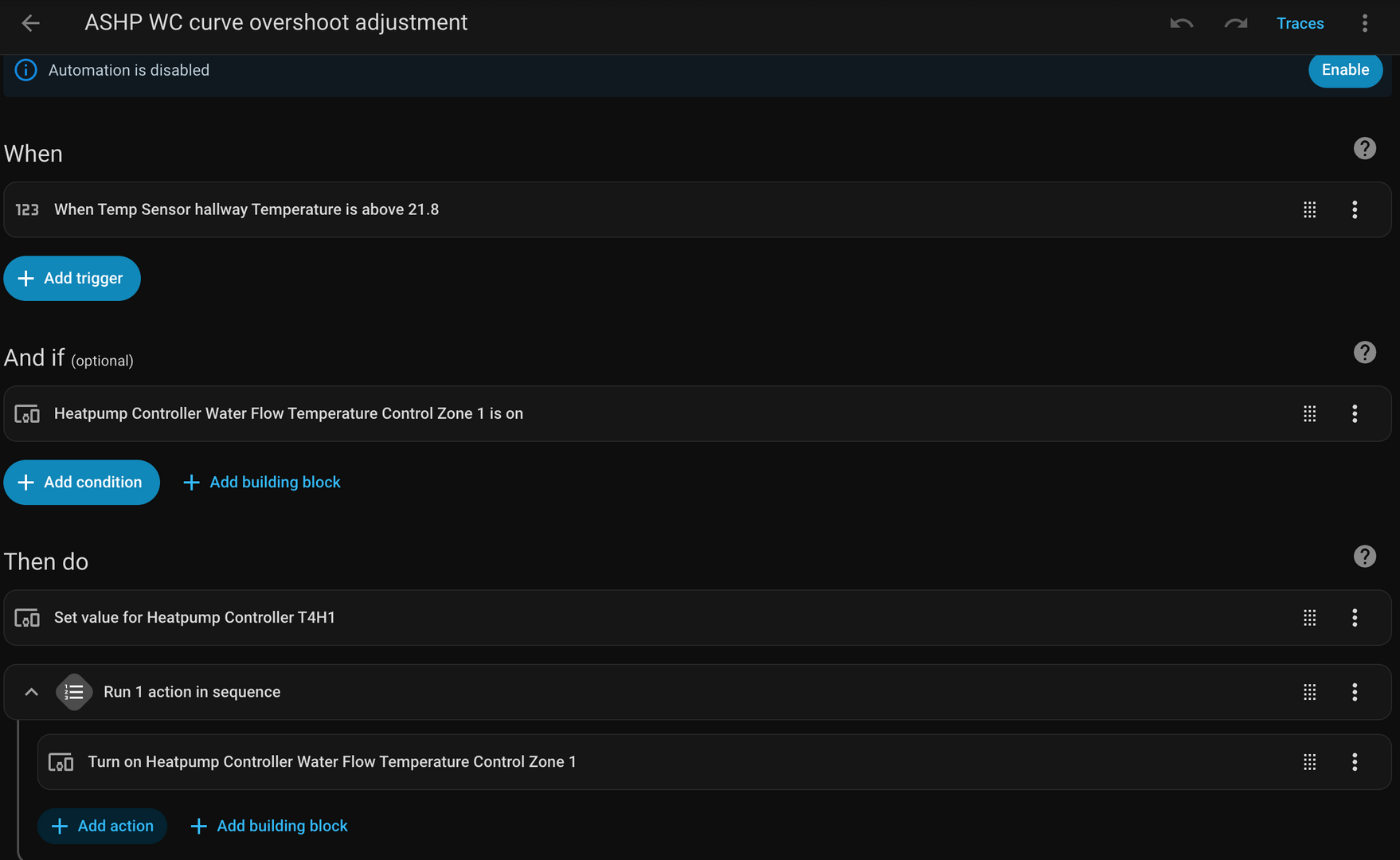 sure. Here's the automation sequence, so pre requisite is that heating must be on (this is what Control Zone 1 entity is). T4H1 is the OAT value at the colder end of the curve so if it was set back from -2, to -1, this would lower the curve sufficiently so it gradually reduces IAT, I found. The last action to run in sequence is then to turn CH back on again: