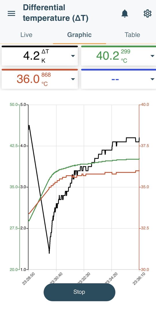 Lastly, I finally managed to get round to rebalancing the radiators after our installers attempts- they said they had done these to provide a ΔT of 5C. I invested in a couple of Testo 115i bluetooth clamps to confirm this. These were super simple to use and with one on each radiator pipe you can plot a graph to show current ΔT: