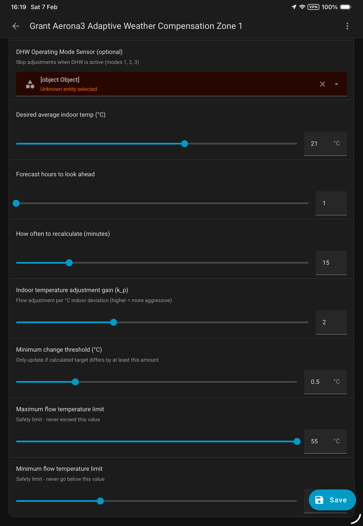 That's good! Is this with the "turn CH back on" automation you mentioned earlier? If so, then another reason to run the WCC adjustments only when the space heating is on. But thinking back to what I have said recently, there is a contradiction in there. I do have a determine whether the DHW heating is on check in the code, but I have just said it doesn't matter whether it is on or not, because I don't have the unit gets turned off problem. Or maybe I did when the DHW heating was on, and that's why I added the check? It is quite a while ago now, and while the code is reasonably well documented, the underlying reason for a bit of code isn't always so well documented... I'll see if I can find any notes I made at the time.