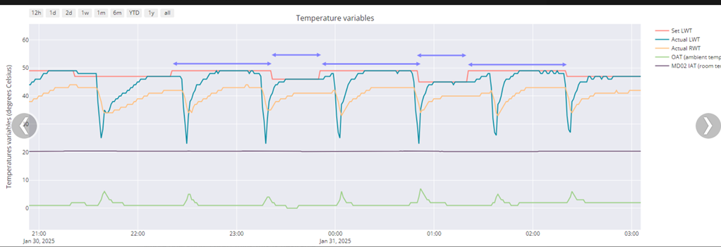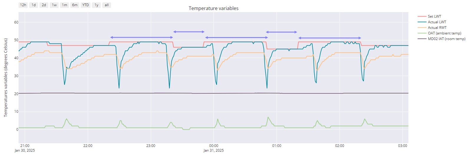 The change in set LWT appears to correlate with OAT, decreasing as the OAT increases and increasing as the OAT decreases, between 10-13C, as you'd expect from a system running weather compensation. Again, this is most likely driven by changes in OAT caused by recirculating cold air than any changes in actual weather conditions. And the system appears to be cycling every ~30mins.