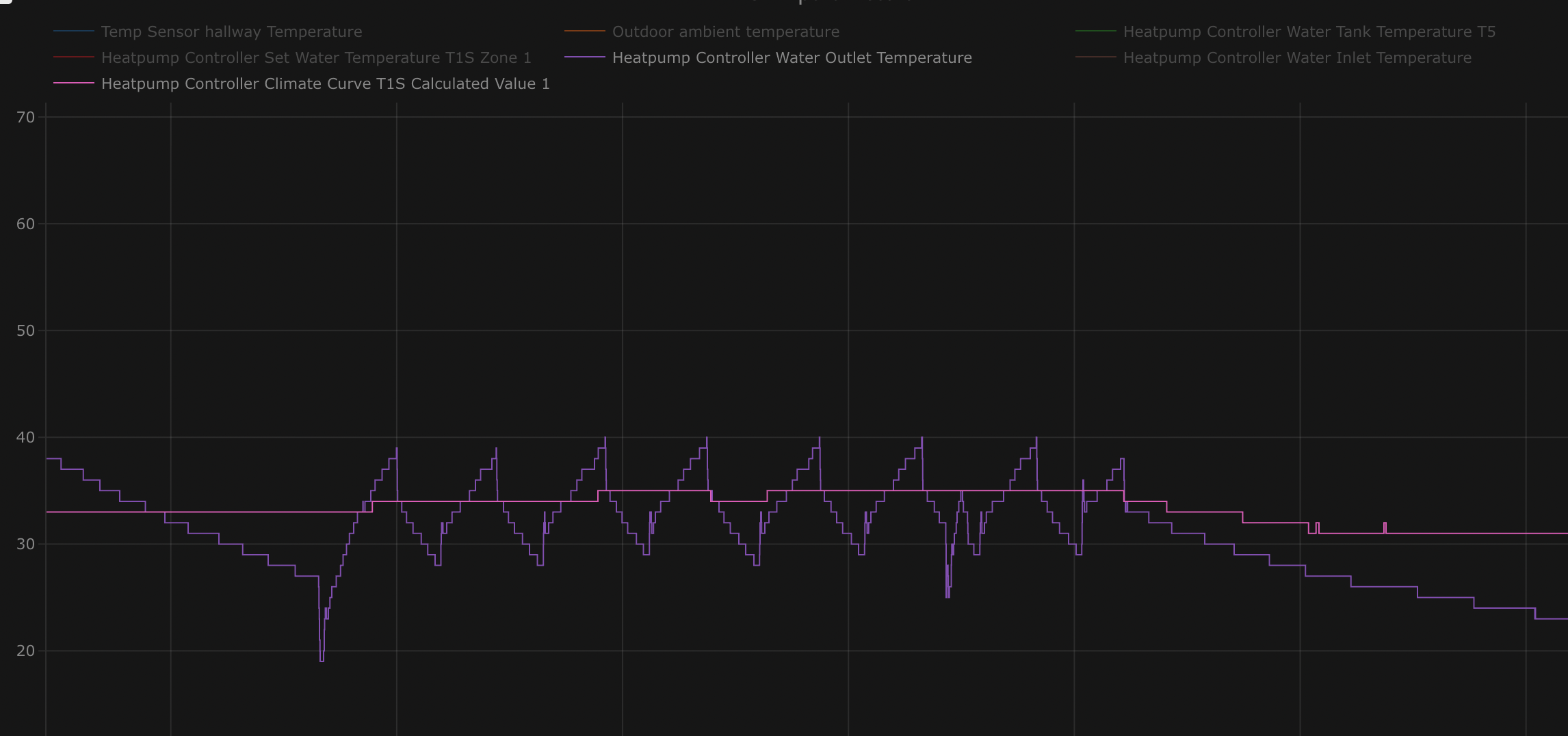 What I have noticed is that if the curve set temp is low 30s it will overshoot to around 35/36, which I presume is down to the unit itself not being able to modulate down low enough to achieve this outlet temp? Our temperature drop (dT?) from outlet to inlet is consistent at around 5-6 degrees C. Yesterday I in fact finished plumbing in our new kitchen radiator, turned off climate curve and just set at 45 degrees C to fully test all of the connections for leaks, and this maintained a steady outlet temp of 45/46 so I'm guessing as above that low 30s, whilst this is the set temp, might not be achievable perhaps as said with a 12kW?