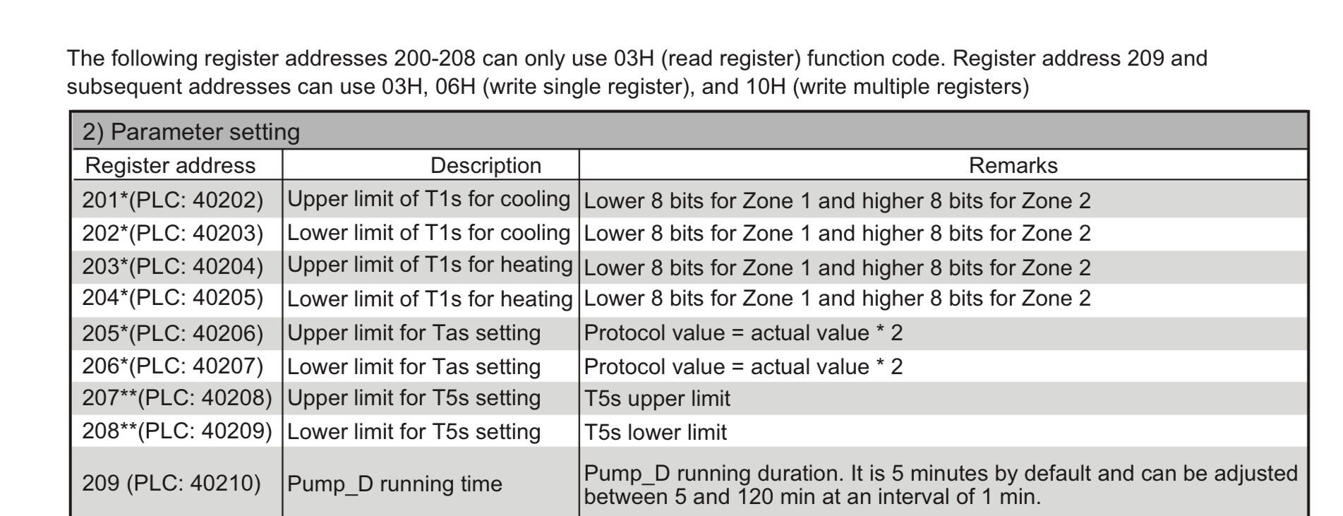 Registers in the 200 range are indeed in the “Parameter Setting” part, and that is also what has make me doubt, but a few of the different modbus register overviews (I collected multiple from different Midea heat pump types and clones) have a statement about the registers we are talking about.