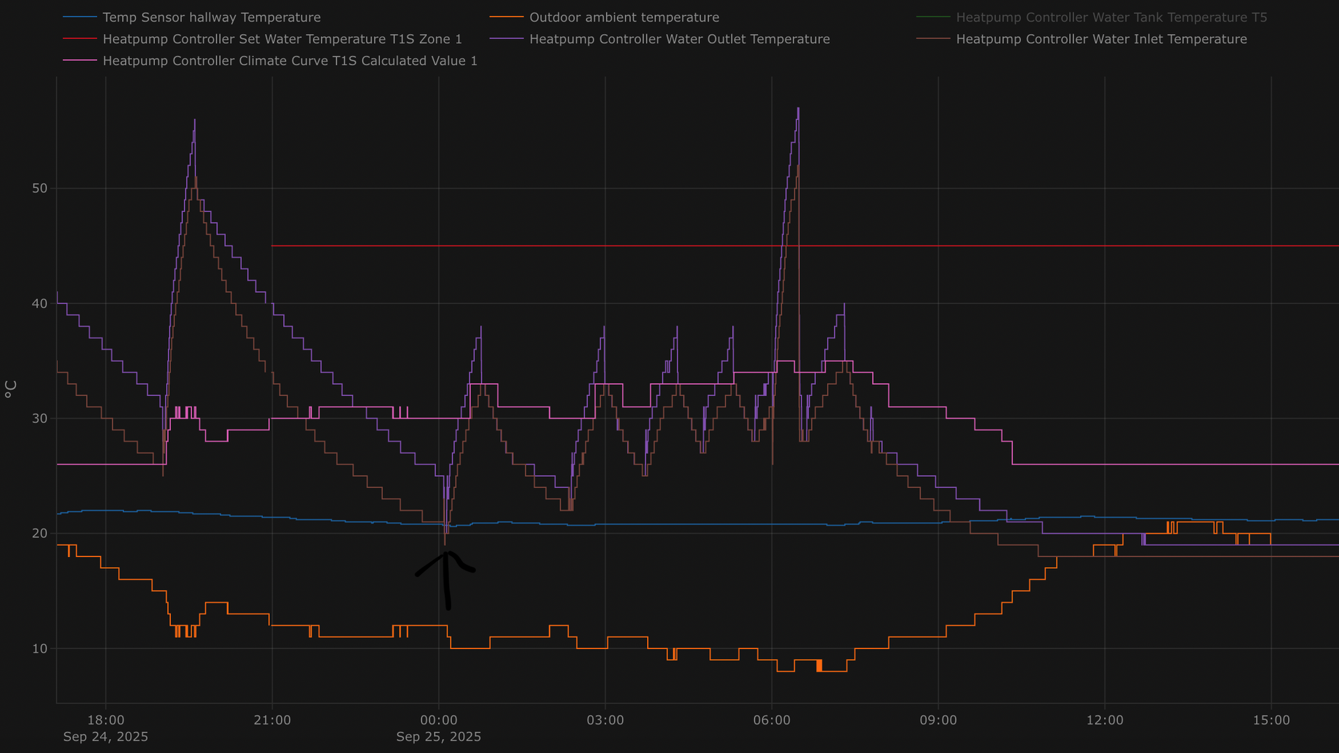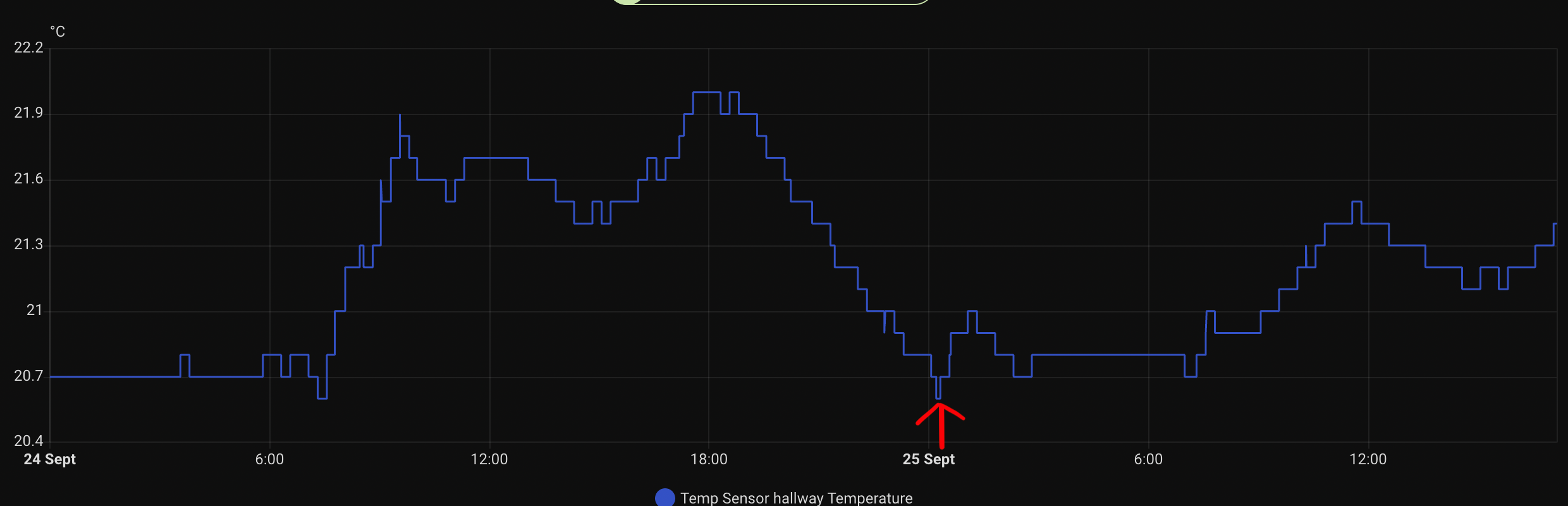 More detailed graph of IAT, red arrow indicating when automation has kicked in. This has then kept the temperature nice and steady overnight up until 0800 when the OAT has increased and solar gain has heated the house. Therefore the WC curve settings seem about right now.