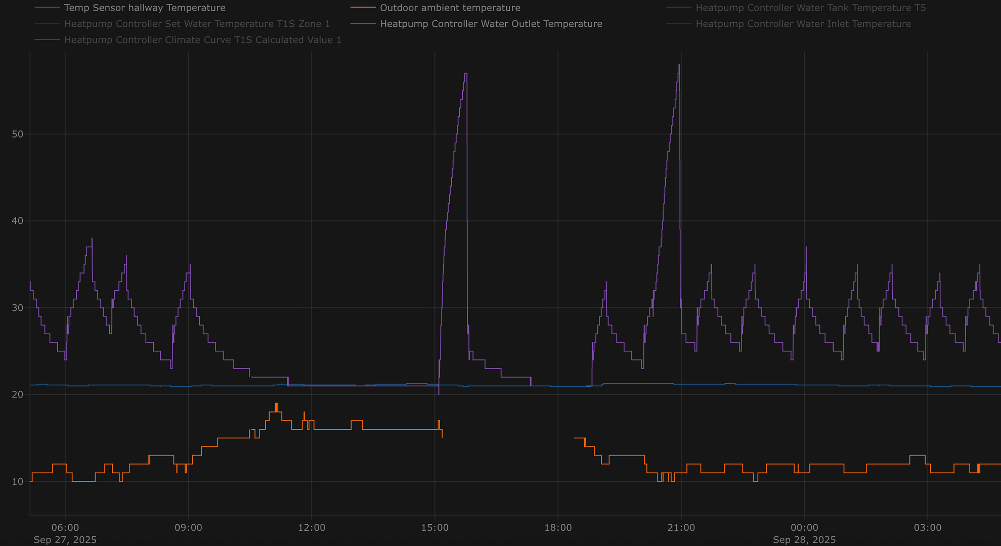 One other observation. COP figures from energy monitoring have definitely taken a dip, following the adjusted WC curve setting with the lower end being 26 rather than 31. Now around 4.3 to 4.4, whereas it was more like 5.0 when set at 31 and more on/off overnight. I presume this is because the 12kW struggles to modulate down this low so whilst it is probably actually cheaper cost wise as it isn't overshooting when running overnight now, it is slightly less efficient in doing so perhaps in terms of kW grid consumption in, versus kW heating out.
