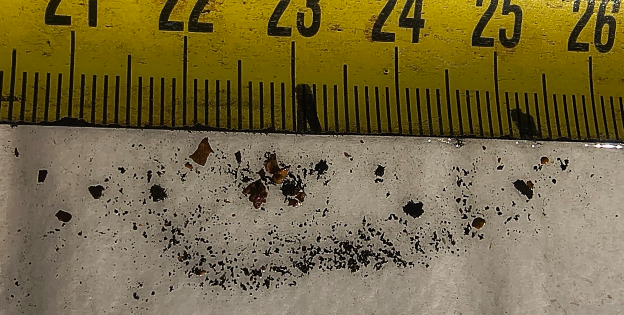 This is the kind of particles you'd expect from cast iron or steel corroded by oxygen. Scale in cm and mm. Unfortunately the cell phone camera can't tell the difference between rust (brown flakes) and magnetite (black particles) but it is clearly visible.