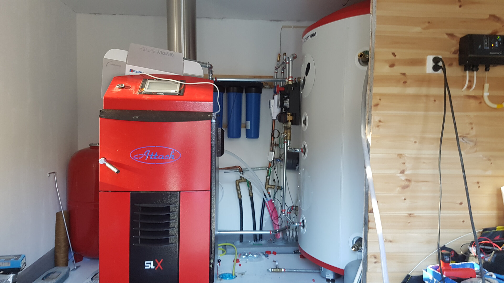 This kind of set-up is very common in places that use wood boilers here in Finland. The tank you see in the picture (the white/red cylinder) has a capacity of 3000L. The picture was taken while I was installing the wood gasification boiler (the red thing in the middle) and heat pump at my house. i can store heat for several days for both heating the house and hot water.