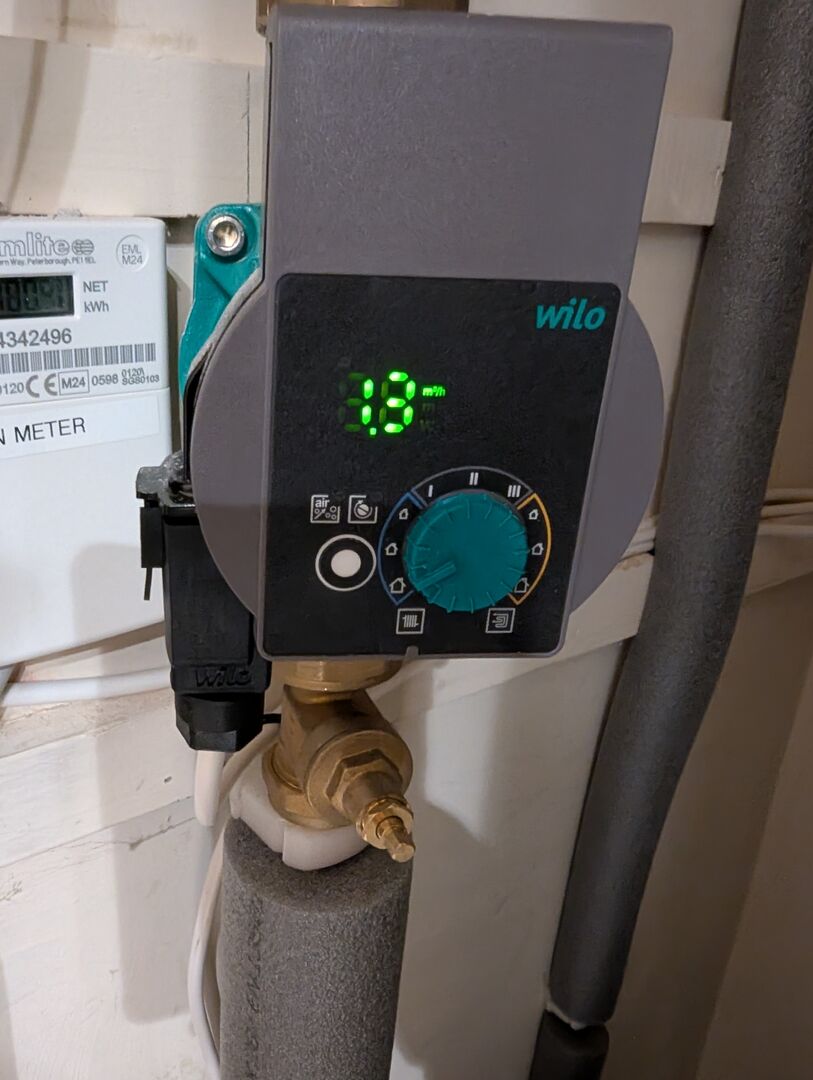 It's worth noting at this point that tweaking the dial brings up another display in metres, which I've learned is the pump head setting in metres, and represents the theoretical vertical height of water that the pump output provides to overcome gravity. This is potentially relevant to my setup as the ground level heat pump feeds pipework that goes vertically up the gable end wall and into the loft, which then feeds into a cylinder cupboard in the centre of the house inside the main bathroom, so there is a more substantial gravitational challenge than many typical installations may have, which may explain why I'm outside the range represented by radiator numbers. The tweaks done so far have reduced the pump head figure from, I think, an original 6.5m setting to one of 4.9m at the 16l/m flow rate.