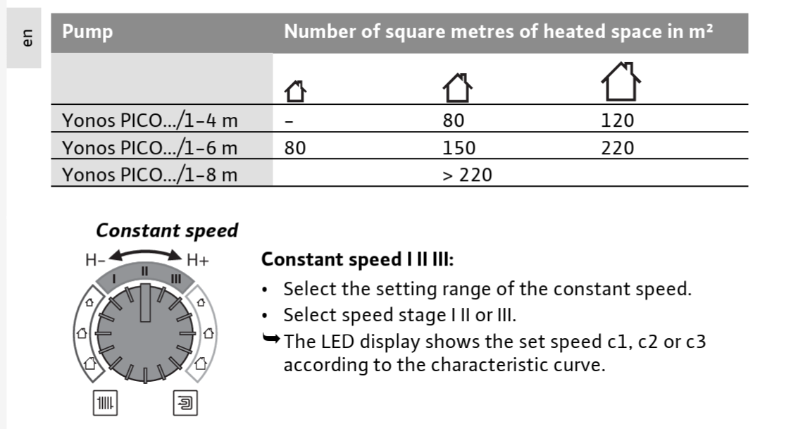 I had also considered whether looking at the constant speed settings as part of the tinkering process might be worthwhile, as the manual references these against square metres of heated space. However, for the 1-8 variant of the heat pump there is only 1 figure displayed, intended for spaces above 220m³, relative to our house being 130m², which doesn't suggest that there's any scope to consider this any further.