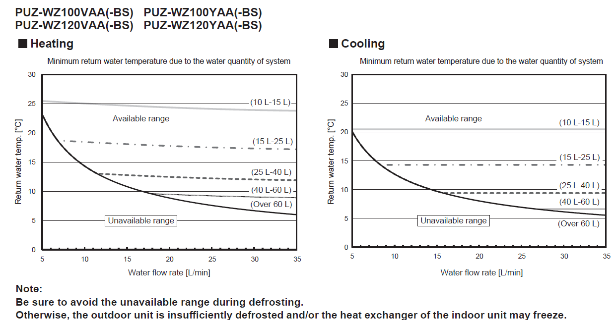 My interpretation of this is that there is potentially scope to reduce the flow rate further, provided that I have a system volume below 60l, but if I'm over this (which is presumably the case with a volumiser tank within it) then I'm already within the 'unavailable range' per the graph and therefore potentially at risk of issues during periods where defrosting is required, which we're currently in the middle of at the moment.