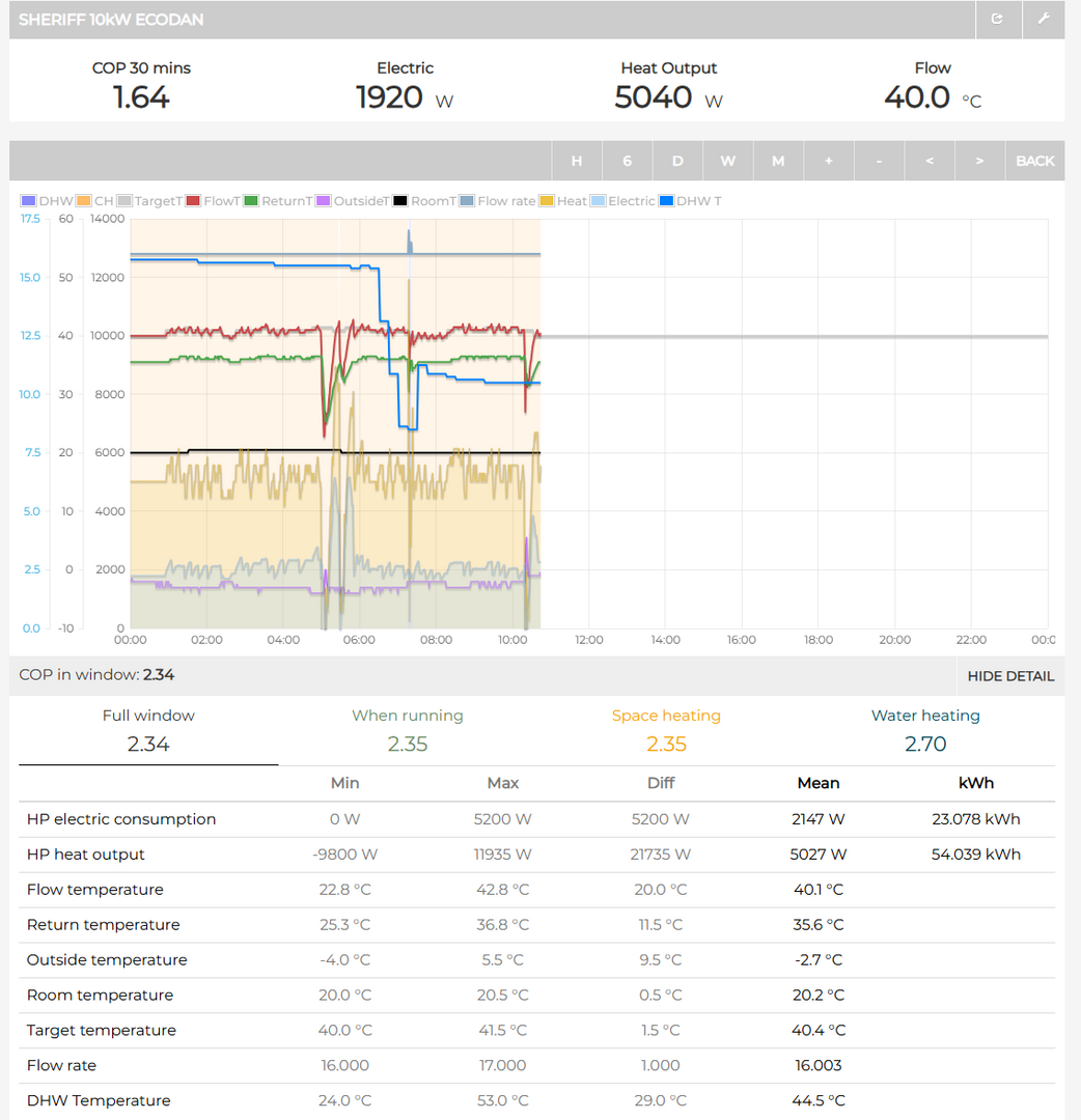 I have a dongle attached to the CN105 port of the system providing various data measurements into the Mel Pump app and also to a configuration of OEM's software via Home Assistant. The two aren't identical, but are close enough to each other for me to use both for different purposes. The OEM provides a better instant view, as above, with the ability to zoom in on specific sections. Mel Pump provides good overall insight and records daily COP figures as produced by the Ecodan system itself. Short of installing one of OEM's heat monitoring systems, the data recording is just about as extensive as it gets for an Ecodan system, but is largely reliant on the Ecodan's own internal reporting datapoints.