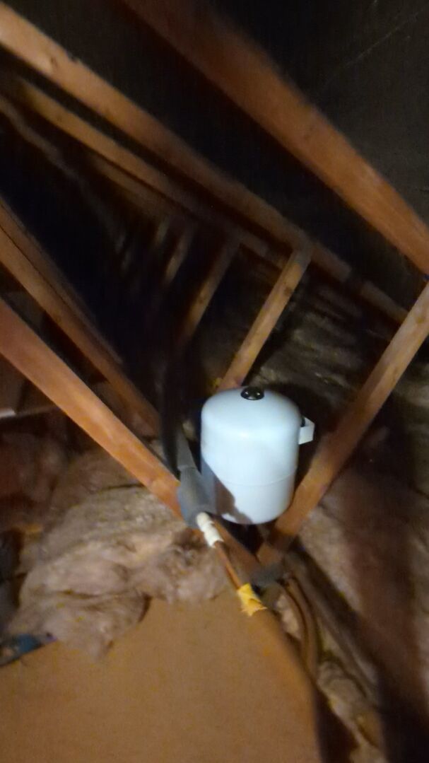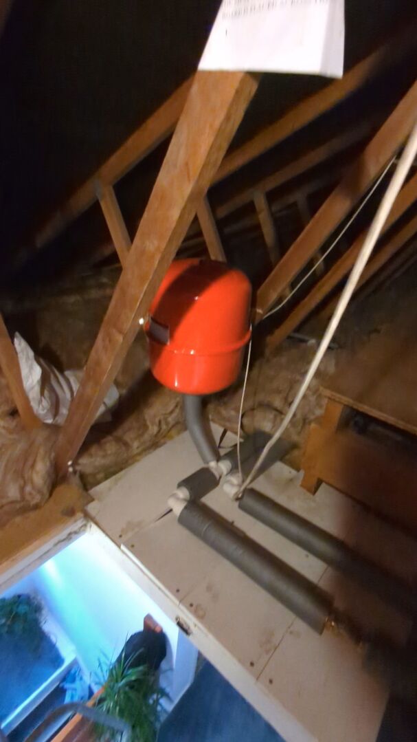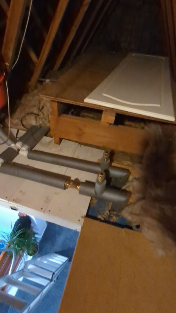 I don't believe that there is a buffer or a low loss header in the system, based on conversations I had with the installation team, who advised that they were going to add a volumiser in the loft when I queried at the start of the job if they were planning to add a buffer tank. I've attached stills from a bit of footage I took in the loft after they had left the site, as you're undoubtedly better informed than me as to what they actually are. The extent of my verification was to note that the red tank had only one input and output flow pipe, so seemed to be consistent with being the 2-port volumiser they referred to, rather than anything with 4 ports. I'm not sure what the white tank is in the other photo, but you can see from the photos that the red one has pipework runs that extend to two entry points into the cylinder cupboard, which is to the right of the entry hatch to the loft. I've added photos of the cylinder cupboard so that you reference how the pipework in the loft is subsequently linked into that. The piping on the right hand side of the cylinder looks to be the bit that goes up to the white tank in the loft.
