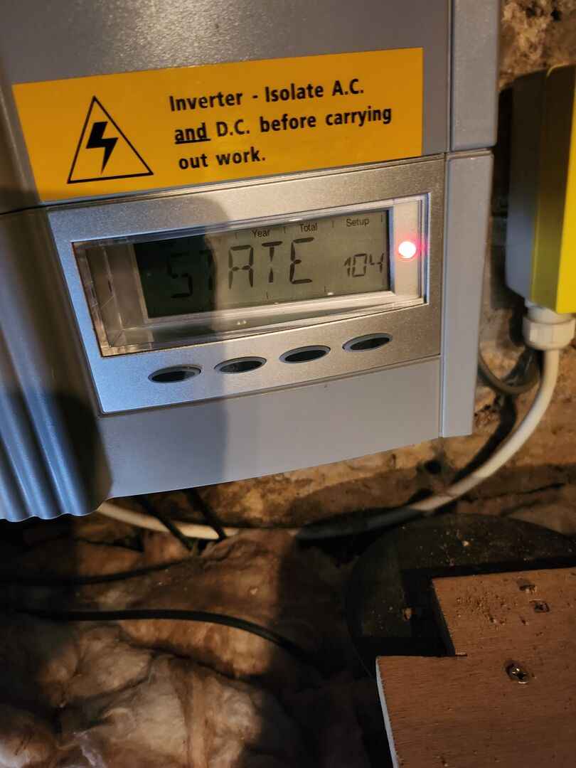 The Fronius IG30 inverter that came with the house's original FIT 2.66 kV solar system, appears to have given up the ghost. Its reporting a state 104 error. It might well have been my fault as I changed my consumer unit over to MCBOs, and the error started when I rebooted. Im assuming its nothing to do with the change from RCD+ MCB to MCBOs (or my wiring!).