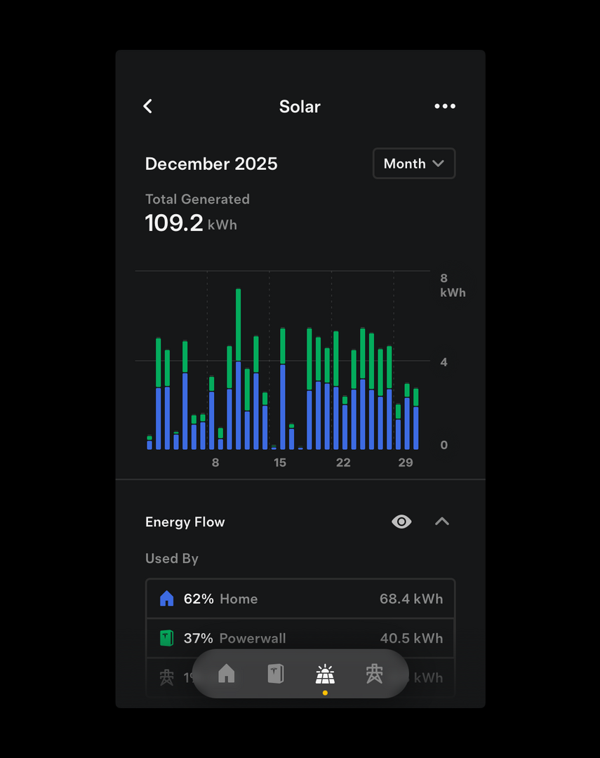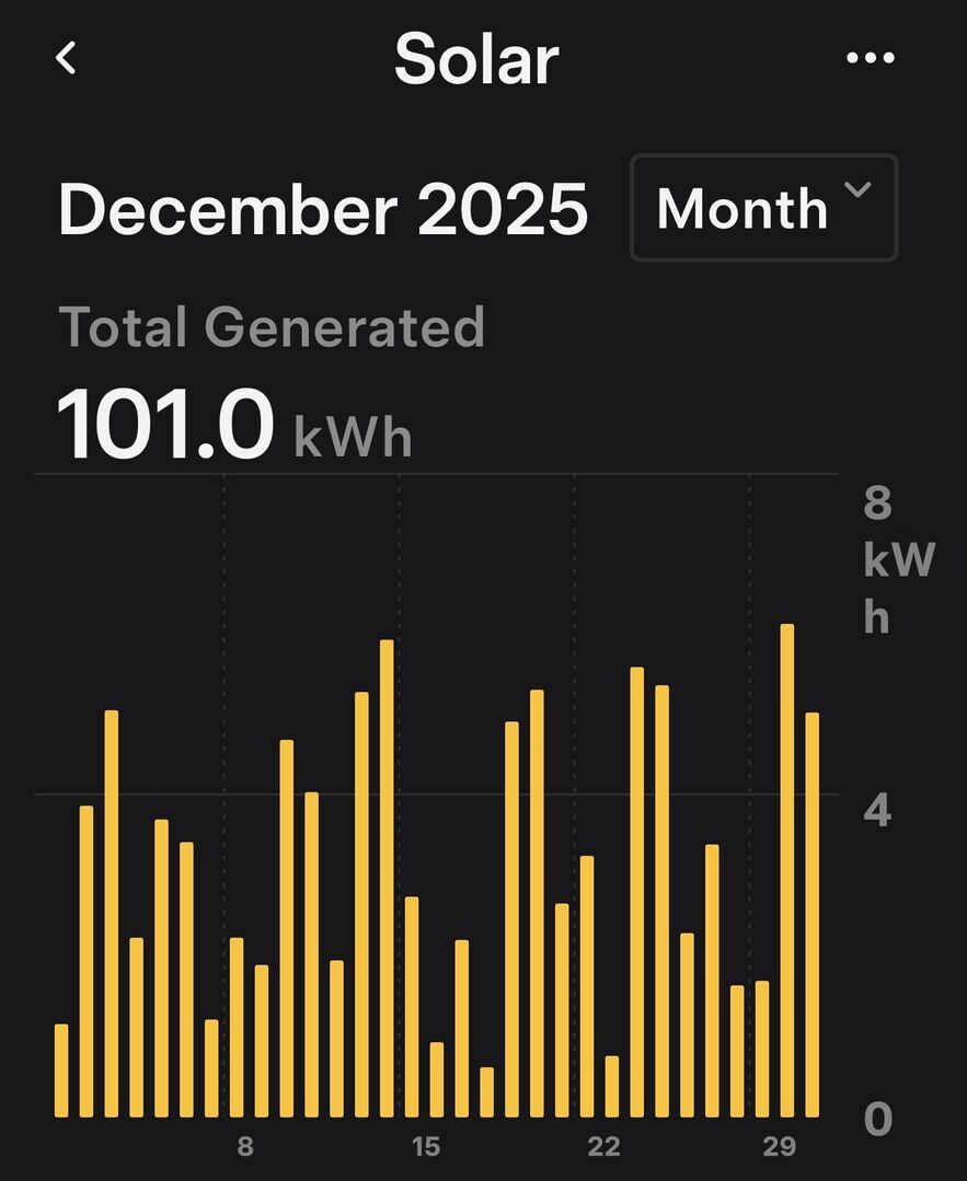 The total production figures for the three years are: 2023 = 6.5 MWh, 2024 = 6.0 MWh and 2025 = 7.1 MWh. The 21 panels total 8.1 kWp. but are neither ideally orientated or free from some shading (particularly at this time of year). Regards, Toodles.