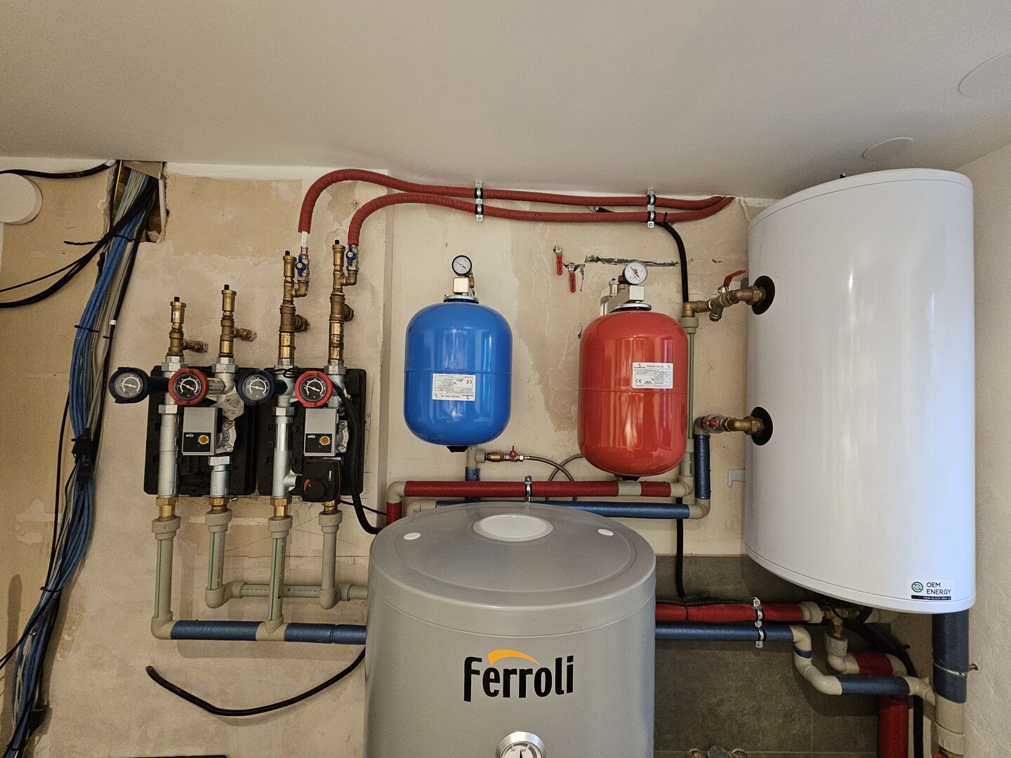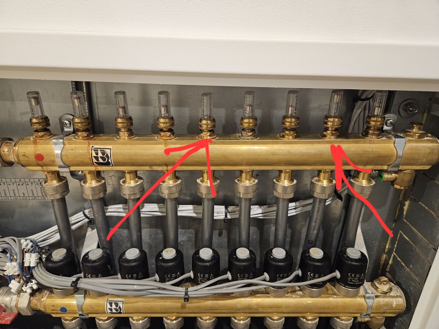 • Ground floor: floor heating in 9 loops (see image, igonre the arrows, those are showing stuff flow meters)