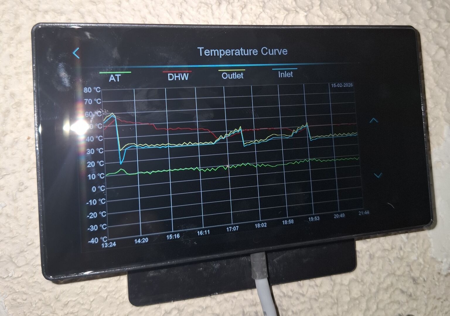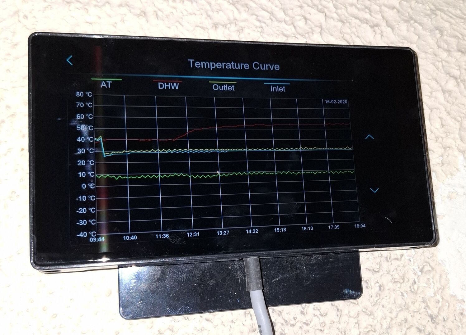 I control temps of the 'zones'- rooms but basically upstairs rads and downstairs rads. When it was installed/ commissioned I was told to keep DHW on 55C and Flow to 50C which were the 'best' settings for the pump because it was a 'high temp' ASHP (expensive). From reading lots re heat pump control and via this forum I now set targets at 45C DHW and and 35C Flow which in practice results in 35-40C DHW and 31-32C Flow, (temp charts showing DHW, Flow, Return and Ambient temps updated at 5 min intervals). At these settings, the pump runs all day, appears to cycle about once every 2 or 3 hours, sometimes longer. Room temps are 20C downstairs and 19C upstairs. I did have lower temps for night time and morning but from information read so far, I now maintain room temps 24/7. I don't understand weather correction so have not used it. Should I?
