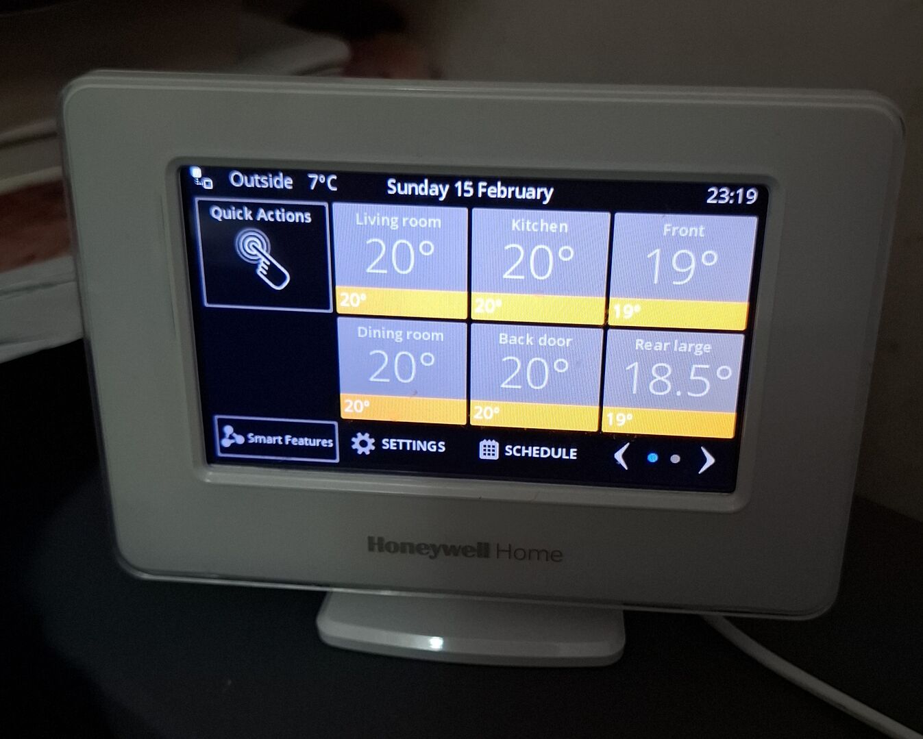 The Honeywell system is still there, with its 10 TRVs intact and working - it just can't turn the heat pump on or off. I have this set to have most room's TRVs set to 28 degrees permanently, thus fully open all the time. A couple of south-facing rooms have their TRVs set to 21 - to throttle back the radiators if the room get's too hot due to solar gain.
