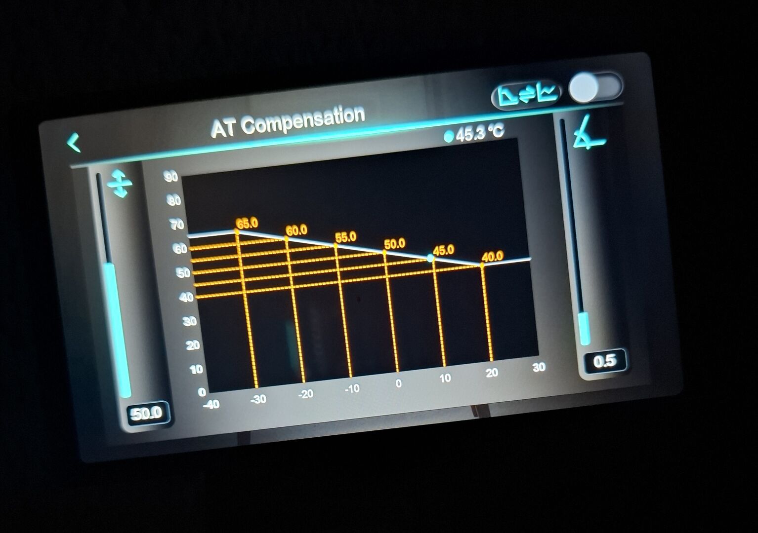 The final picture is your weather compensation curve. This changes the temperature of the water that the heat pump produces to feed the radiators according to the outside temperature. With the current settings its likely you are paying 30% -50% more for your heating than you need to and are less comfortable than you could be. Dont panic though, it can be changed and we will provide help.