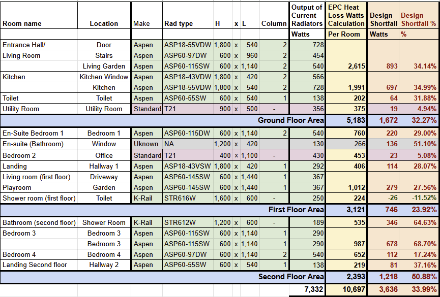 The spreadsheet shows positive figures as the shortfall, in red, and the negative figures are green and good as these are higher than the existing heat loss. Hope it makes sense.